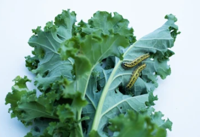 Image 3: A close-up of kale leaves with cabbage loopers.