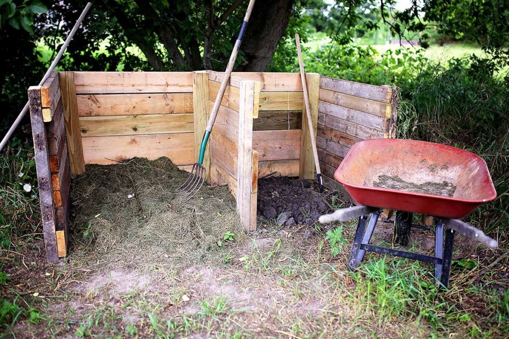 Image 3: A compost station with wooden bins beside a wheelbarrow and garden tools.